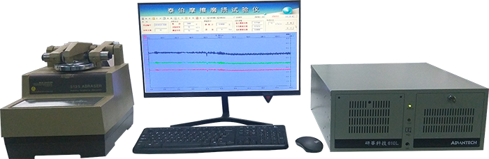 將待測材料放在轉(zhuǎn)盤上,兩個磨輪施加一定載荷,使其由轉(zhuǎn)盤帶動以一定速度做旋轉(zhuǎn)磨耗運動。試驗承受磨耗時,樣件表面材料受全角度顆?;蚪z織狀物磨損形成一完整的圓環(huán)。磨輪隨樣件盤轉(zhuǎn)動面轉(zhuǎn)動,產(chǎn)生相對運動和磨耗,而轉(zhuǎn)動過程中磨輪軸相對于轉(zhuǎn)盤轉(zhuǎn)軸的偏移產(chǎn)生滑移運動,通過傳感器獲取摩擦?xí)r的扭矩信號,經(jīng)放大處理,輸入計算機經(jīng)A/D轉(zhuǎn)換將扭矩信號通過運算得到摩擦系數(shù)曲線。從而磨耗材料。