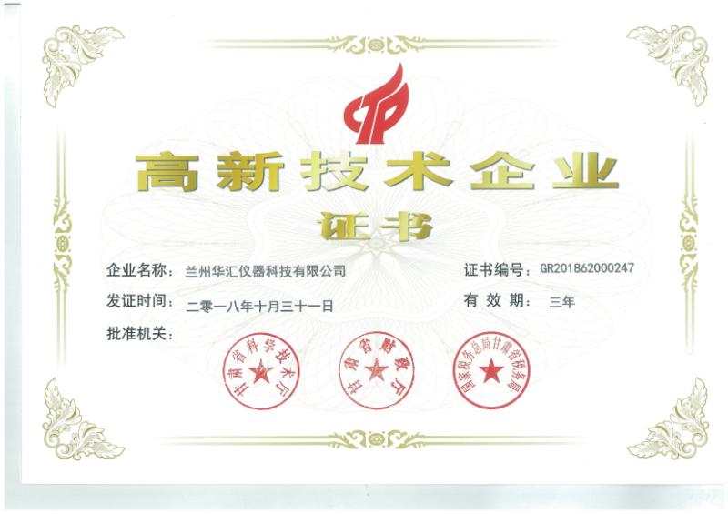 經(jīng)國家科技部、財(cái)政部、國家稅務(wù)總局專家評(píng)審,蘭州華匯儀器科技有限公司通過高新技術(shù)企業(yè)認(rèn)證,獲得國家頒發(fā)的《高新技術(shù)企業(yè)證書》。